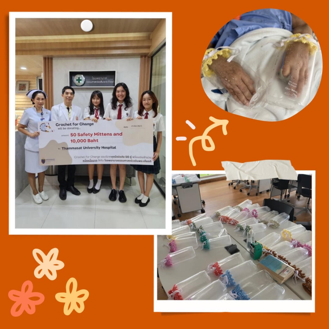 On Friday 25th of August 2023, we: Anabel (Y12), Jelly (Y12), and Tun (Y12), made a trip to Thammasat University Hospital to deliver our charity’s very first project - recycled crochet safety mittens - as well as 10,000 baht that we have raised through our fundraisers. Everything we had been doing the past year for Crochet for Change had led up to that moment.Our after school sessionsOver the past year, we have been settling down in Mr Smith’s English classroom every Wednesday after school to teach our members from all throughout senior school basic crochet skills that were needed to make a safety mitten. The material of these safety mittens are recycled saline bags given to us directly from the hospital. We crocheted the sleeves and later threaded ribbon around to ensure that the mittens could be secured firmly on the patients. Prior to our after school sessions, most of our members had little to no experience crocheting, so it was an opportunity both for them to learn a new skill and for us to teach and interact with students from different year groups in an effort to give back to the community. Apart from learning a new skill and working on the project, a lot of people have also found our after school sessions a nice time to relax and connect with friends after a long day at school.FundraisersDuring our Halloween and Christmas fundraisers, we asked our advanced crocheters to help us in producing small unique crochet items to sell at our stalls.For our Halloween and very first fundraiser, we sped-crocheted 30 pumpkin keychains which to our surprise, sold out in a mere two minutes! That incident let us gain a better grasp of the size of our demands so we could plan more wisely for our next fundraising event.As December approached, we briefly put aside our mittens project to focus on crocheting prizes for our Christmas Snow Toss challenge. Held in the span of three days, this event allowed students to try their luck at throwing crocheted snowballs into buckets of different sizes - the smaller the bucket, the better the prize. Our prizes ranged from cute crochet plushies, to crocheted bookmarks, coasters and scrunchies which were all made by our wonderful members. The majority of the money we raised was later donated to Thammasat University Hospital during our visit and the rest was used to fund the equipment for our sessions.The DonationWhen we arrived at the hospital, we were taken to the Kittiwattana building where we met Nurse Pum and Professor Paskorn Sritipsukho. There, we presented our mittens to them and Anabel gave them a brief overview of what our charity was and what our aims were. After posing for a few photos, we made our way across the hospital to their charity centre, where we donated 10,000 baht that we raised through our various fundraisers.After signing documents and making the donation official, we were asked if we would like to see safety mittens used in a real life scenario. We were guided back to the Kittiwattana building where we met a bedridden patient who used safety mittens to help their treatment. The nurse explained to us that these work best on weaker patients who might have the tendency to pull on their IV drips and/or any tubes that are giving nutrients or medication to patients.ConclusionOn the behalf of the leaders, we would admit that when we first brainstormed the idea of a crochet related charity, we would have never expected so many students to be interested in involving themselves in our club. On top of meeting new friends and making new memories, this was a great opportunity for all three of us to try our hand at leading a large group of people, compromise under circumstances and plan large events. This past year has been nothing short of fulfilling and we look forward to expanding our club and aims next year.
