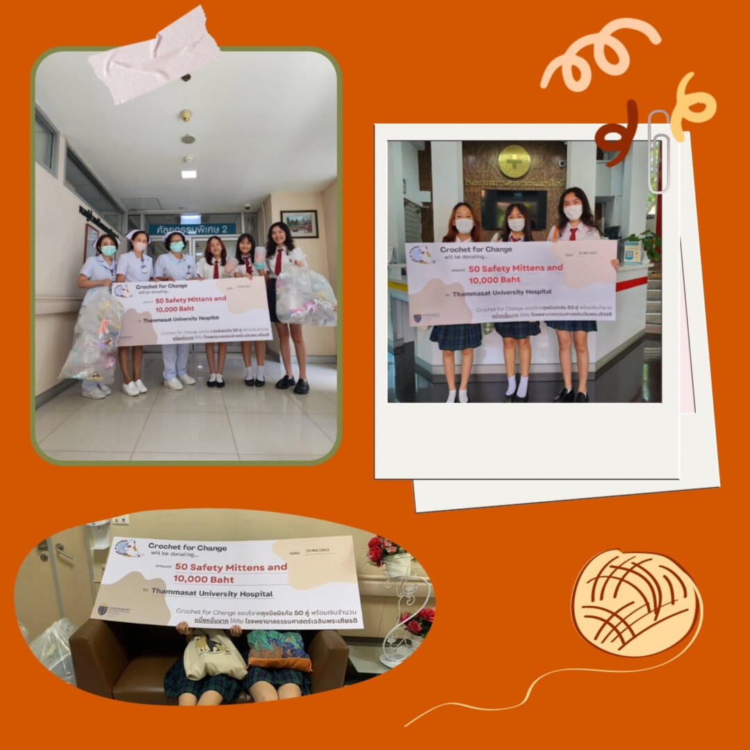 On Friday 25th of August 2023, we: Anabel (Y12), Jelly (Y12), and Tun (Y12), made a trip to Thammasat University Hospital to deliver our charity’s very first project - our recycled crochet safety mittens - as well as 10,000 baht that we have raised through our fundraisers. Everything we had been doing the past year for Crochet for Change had led up to that moment.writer: Jellanai Tongpaitoon (Jelly)